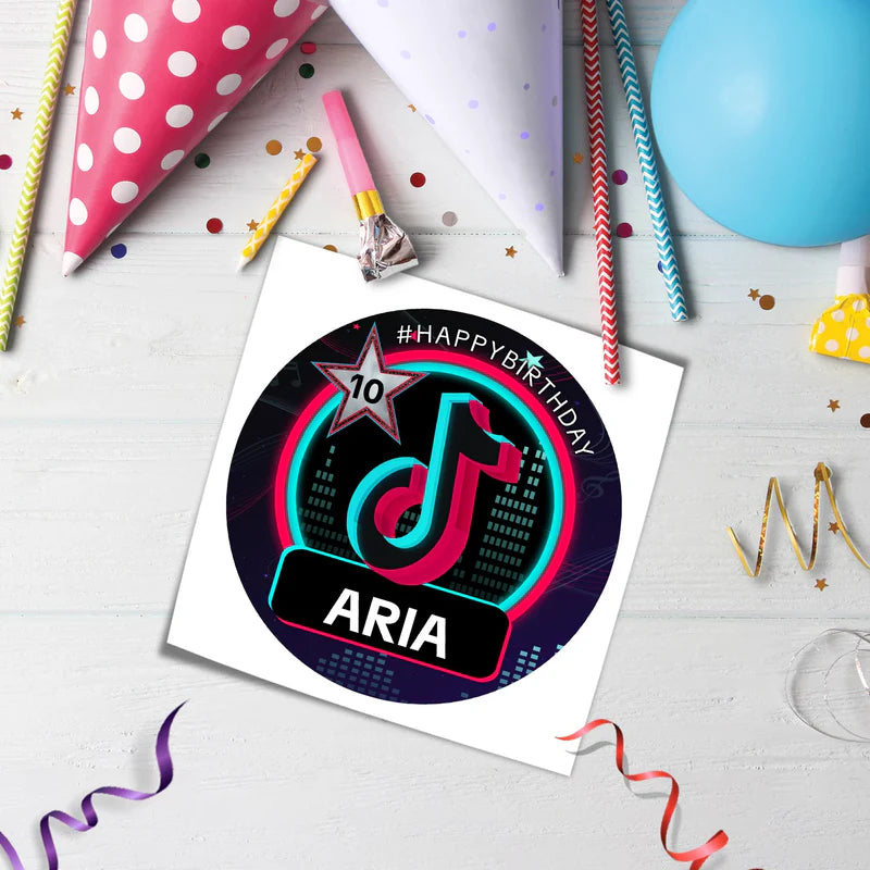 Edible icing image cake design featuring a custom Tiktok theme. Add your child's name for a personalized touch. Use on sheet cakes or round cakes for a vibrant and delicious party decoration. Digital download for bakery printing.
